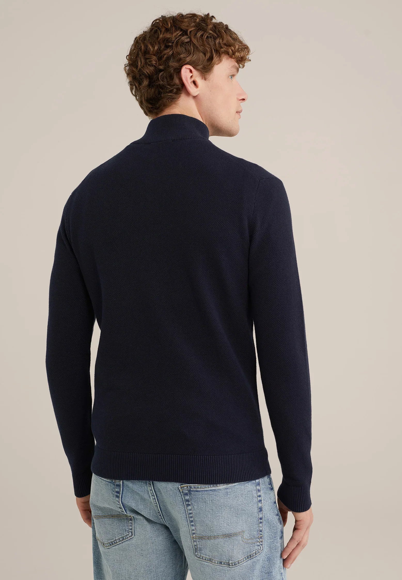 Men's Cotton Jumper with Troyer Neck and Zip - Navy Blue
